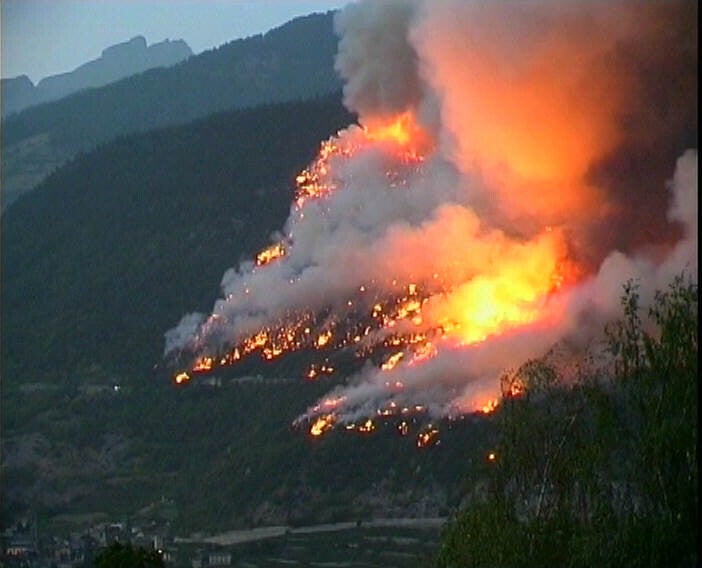 Am gegenüberliegenden Hang, oberhalb Leuk, brannten 2003 über 700 Hektaren Wald ab. Soweit möglich, wurde die Brandfläche der Natur überlassen.